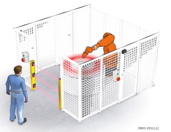 Light curtains are a form of collective protection that allow access to an area without removing guarding. This protection is favored when frequent access to a danger zone is necessary. When crossing through the light curtain, energy to the machine inside the danger zone is stopped. In order for the process to go on, you have to go outside and restart the machine. Never stand behind the light curtain if the machine is running. This situation can lead to serious injury.