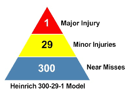 The Heinrich 300-29-1 model states that for every 300 near misses, there are 29 minor injuries and 1 major injury. These injuries significantly decrease when near misses are corrected before they have the chance to affect someone.